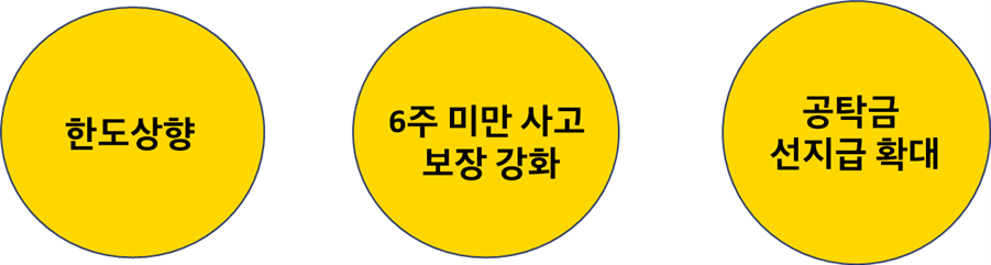- 12대 중과실 사고 중 6주 미만의 경미한 부상 사고에 대한 처리지원금 담보가 신설되거나 보장 한도가 확대.